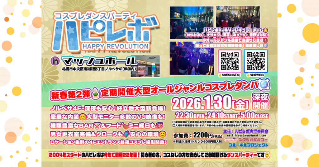 2026年1月30日(金)に開催される“ハピレボ in マッシュホール オールナイト#17”にアプリのチェックイン用のQRコードが設置され、利用が可能となりました!