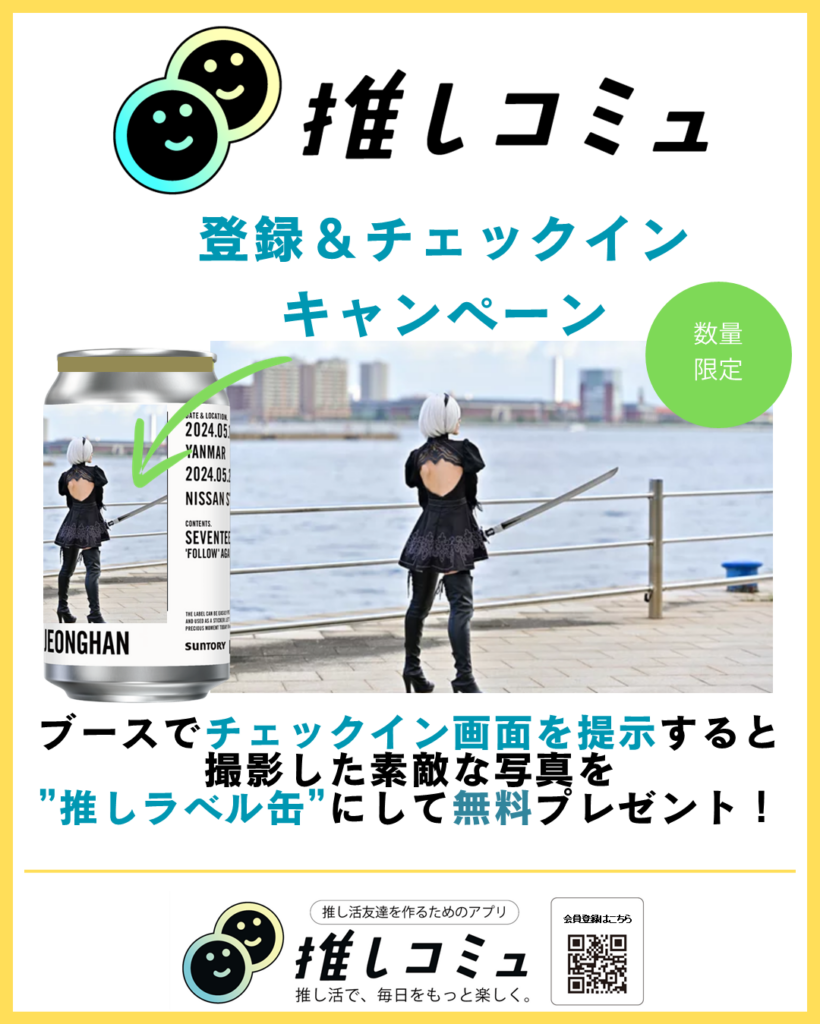 アプリ「推しコミュ」に会員登録・チェックイン(専用QRコードの読み取り)で、ご自身のスマートフォンの写真でその場でオリジナルラベルに印刷して、飲料缶と一緒にプレゼントいたします。
